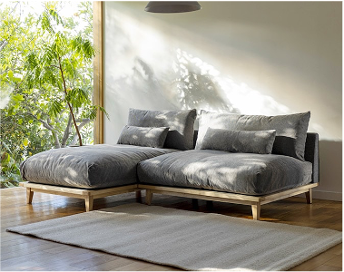 家族が集まる団欒スペースで、座り心地、日常のメンテナンスに気を使った子育てママに最適なソファを選択します。